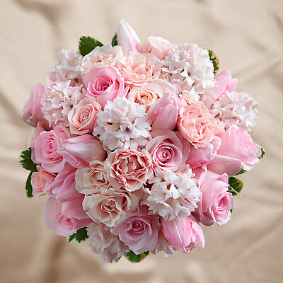 The Dawn Rose™ Bouquet is a display of blushing sweetness full of feminine charm. Pink roses, tulips, spray roses and hyacinth are brought together to form a bouquet that is both eye-catching and elegant tied together with a pink satin ribbon for a complete look.Approximately 9-inches in diameter.